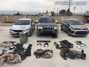 بتاريخ 24 / 2 / 2023 نفّذت قوة من الجيش في بلدتي حورتعلا وبريتال في البقاع عمليات دهم لمنازل مطلوبين بجرائم الخطف وإطلاق النار وتجارة المخدرات وسرقة السيارات، وضبطت 3 سيارات مسروقة وكمية من المخدرات والذخائر الحربية، وأعتدة عسكرية ومعدات لسرقة المنازل والسيارات.