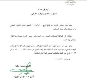 صدر عن رئاسة مجلس الوزراء مذكّرة تقضي بتأجيل بدء العمل بالتوقيت الصّيفي، إستناداً إلى الموافقة الإستثنائيّة الصادرة عن رئيس مجلس الوزراء بتعديل هذا القرار إستثنائيًّا هذا العام، بحيث يتمّ تقديم السّاعة ساعةً واحد اعتباراً من منتصف ليل 20 – 21 نيسان 2023، تاريخ بدء التوقيت الصّيفي لهذا العام.