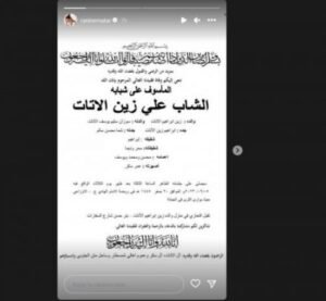 وعبر الستوري على إنستغرام نشرت رنين مطر صورة لخطيبها السابق علي وأرفقتها بعبارة “ملاكي”، كما نشرت صورة للنعوة وقد ذُكر فيها أنه سيُصلى على جثمانه اليوم الثلاثاء في روضة الإمام الهادي- الأوزاعي.