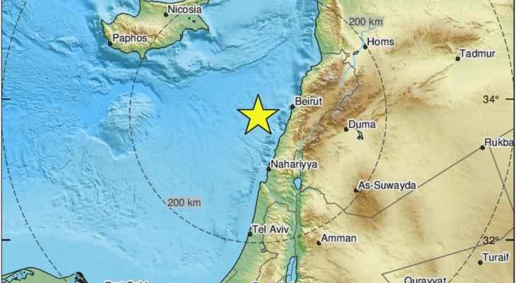 المركز الوطني للجيوفيزياء: هزة أرضية مساء بقوة 3,4 على مقياس ريختر موقعها في البحر على بعد 80 كيلومترا من بيروت، وقد شعر بها بعض المواطنين على طول الشاطئ اللبناني