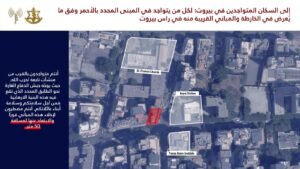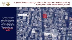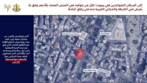 وجّه المتحدث باسم الجيش الإسرائيلي أفيخاي أدرعي تحذيراً إلى السكان المتواجدين في منطقة بيروت وتحديدًا لكل من يتواجد في المباني المحددة بالأحمر وفق ما يعرض في الخرائط المرفقة والمباني المجاورة لها في المناطق التالية: راس بيروت، المزرعة، زقاق البلاط، مصيطبة.