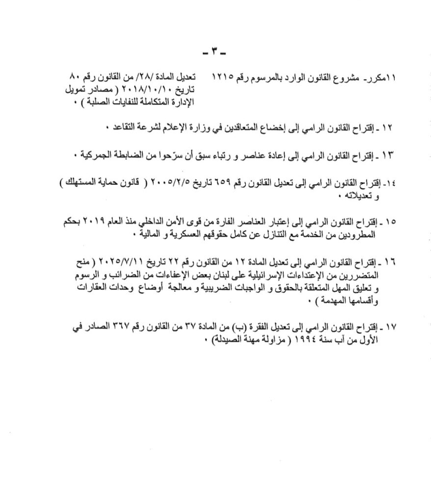 يعقد مجلس النواب جلسة في تمام الساعة الحادية عشرة من قبل ظهر يوم الثلاثاء الواقع فيه 28 تشرين الأول 2025 وذلك لمتابعة درس مشاريع وإقتراحات القوانين التي كانت مدرجة على جدول أعمال جلسة 29 أيلول 2025.