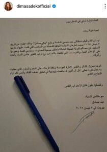 يتم تداول صورة على مواقع التواصل الاجتماعي تظهر رسالة كتبتها الاعلامية ديما صادق تعلن فيها عن استقالتها من محطة الmtv اللبنانية وبرنامج “حكي صادق”, بعد تعارض المواقف السياسية بينها وبين ادارة المحطة، متوجهة بالشكر لكل من قدم لها خلال الدعم ولادارة المحطة متمنية لهم دوام النجاح والتقدير.. هل ما ينشر حقيقة او مجرد تضليل اعلامي والاهم هل ستقبل المحطة استقالة ديما صادق؟!