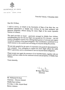 وأشارت الرسالة إلى أن “الوجبة التي تم تقديمها على متن الطائرة، والتي تولت “الميدل ايست” ترتيبها بلطف، على الرغم من أن الرحلة كانت مشغلة من شركة ITA Airways، لم تكن مجرد مبادرة بروتوكولية، بل شكّلت تعبيراً مميزاً عن الترحيب والاحترام لأعضاء الوفد البابوي كافة”، مؤكدة أن هذا الاهتمام “ساهم في تعزيز راحة أعضاء الوفد ورفاهيتهم طوال الرحلة”.