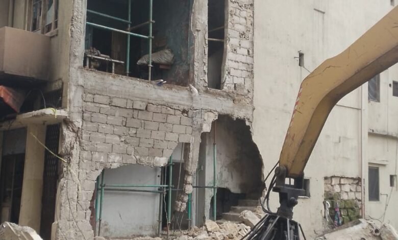 ازالة الردم من المبنى المنهار في منطقة القبة في طرابلس للعمل على تدعيم المبنى المجاور له