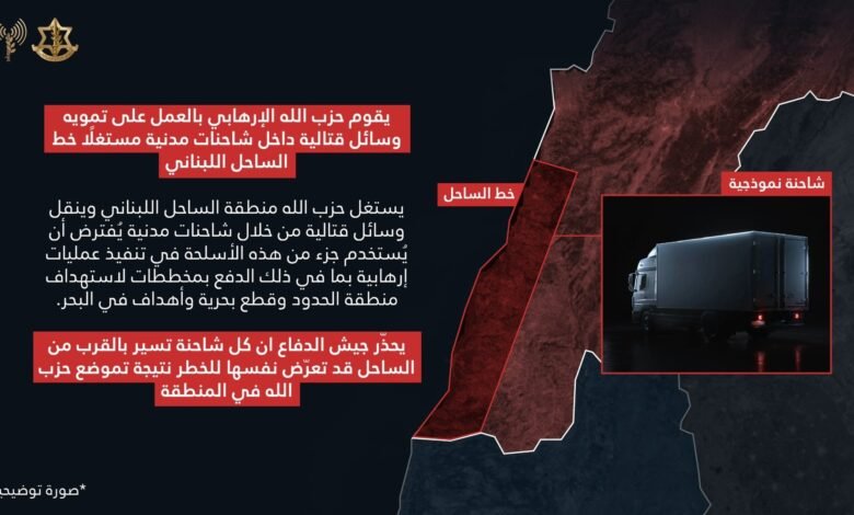 “وفقًا لمعلومات استخبارية وصلت إلينا يمكننا الآن الكشف عن قيام حزب الله بالعمل على تمويه وسائل قتالية داخل شاحنات مدنية ويستغل منطقة الساحل اللبناني لنقل وسائل قتالية من خلال شاحنات مدنية.