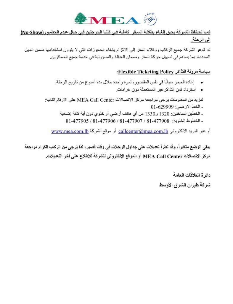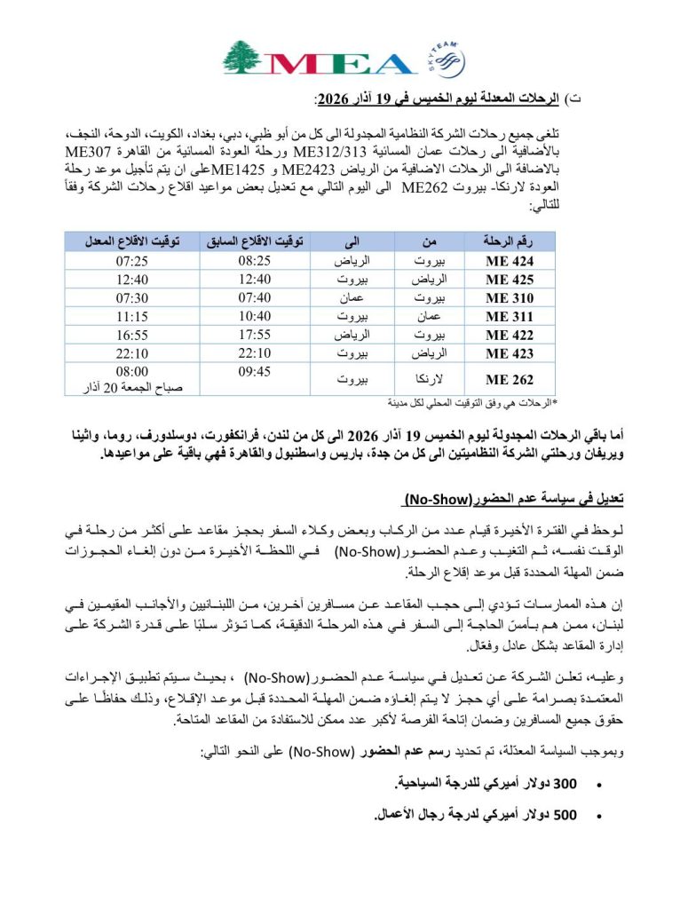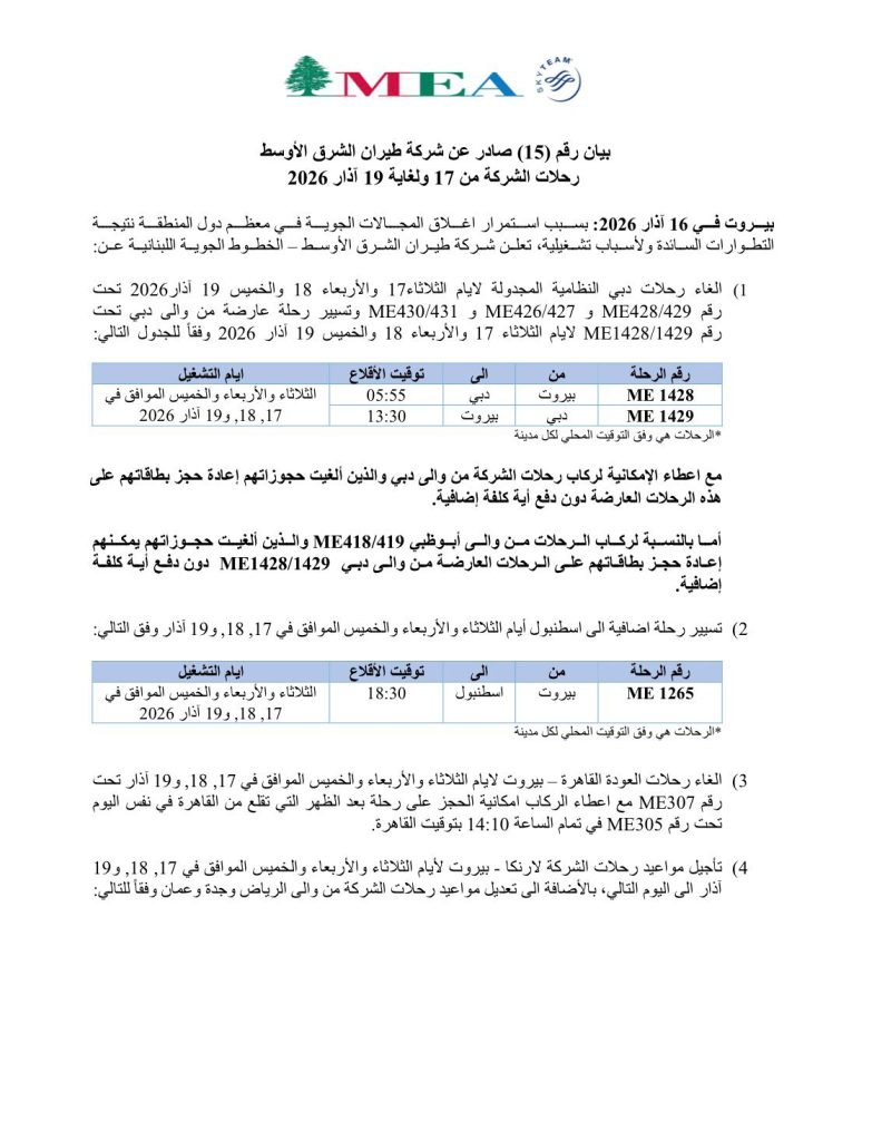 أصدرت شركة طيران الشرق الأوسط بيانا بشأن رحلات الشركة من 17 ولغاية 19 آذار 2026، معلنة إلغاء رحلات وتأجيل مواعيد رحلات أخرى وتسيير رحلات اضافية الى اسطنبول.