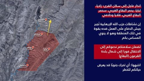 إنذار إسرائيلي عاجل إلى سكان القرى اللبنانية: زلايا لبايا يحمر (البقاع الغربي) سحمر (البقاع الغربي) قلايا دلافي بوجوب الانتقال فوراً إلى شمال بلدة القرعون (البقاع)