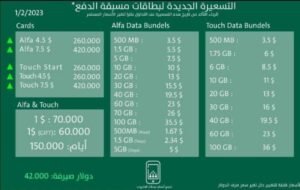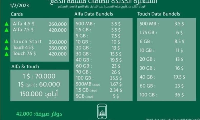 هكذا ستصبح الأسعار الجديدة لبطاقات مسبقة الدفع من ألفا وتاتش بعد ارتفاع دولار صيرفة إلى ٤٢ ألفا.
