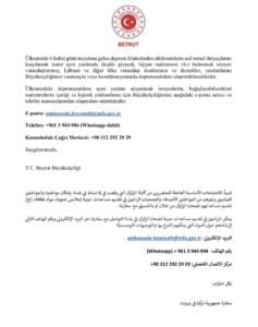 تلبية للاحتياجات الضرورية للمتضررين من الزلزال، طلبت السفارة التركية في بيروت من الراغبين بالمساعدة التواصل والتنسيق معها لإعطائهم التوجيهات اللازمة لوجستياً من أجل التبرع.