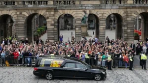 وتجمعت الحشود بأعداد كبيرة في وسط إدنبره لتحية الموكب الذي ضم الأميرة “آن” ابنة الملكة ووصل إلى قصر هوليرود هاوس، حيث استقبله حرس الشرف العسكري.