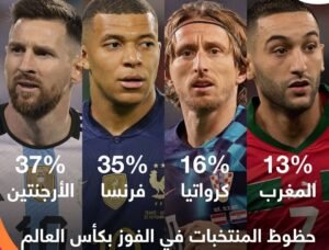 توقعت Five thirtyEight’s SPI أن الأرجنتين المرشح الأول بالفوز بكأس العالم بنسبة 37%، تليها فرنسا بنسبة 35%، ثم كرواتيا بنسبة 16%، والمغرب بنسبة 13%