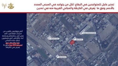 وجّه المتحدث باسم الجيش الاسرائيلي أفيخاي أدرعي “إنذاراً عاجلاً إلى سكان منطقة البقاع، وتحديدًا المتواجدين في المبنى المحدد في الخارطة…